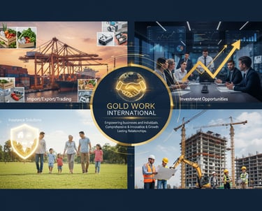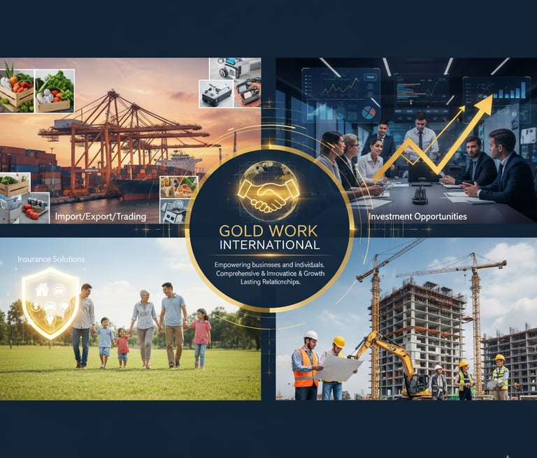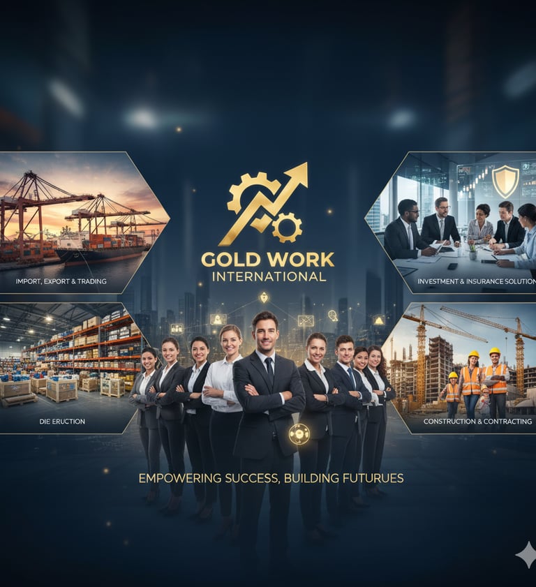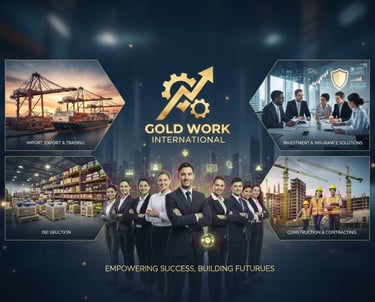 At Gold Work International, our mission is to empower businesses and individuals to achieve their goals through our comprehensive and innovative services in import, export, trading, investment opportunities, insurance solutions, and construction and contracting. We are committed to delivering excellence, fostering growth, and building lasting relationships with our clients and partners worldwide. Our team of experts is dedicated to providing tailored solutions that ensure success and peace of mind.